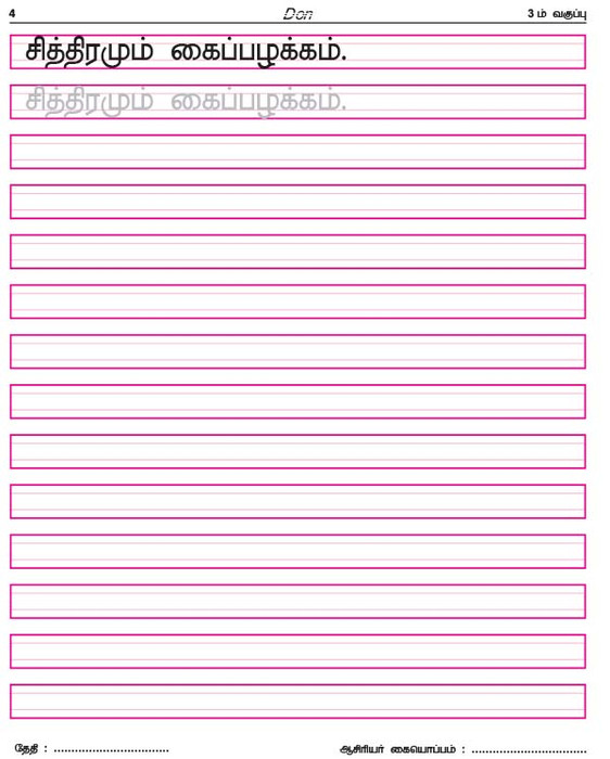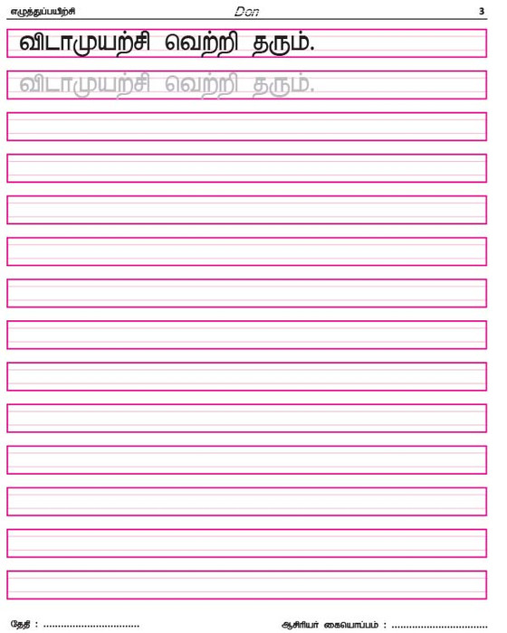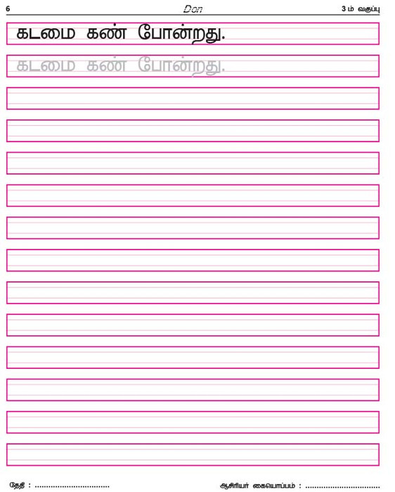 For 3rd Std. students, to practice writing Tamil words and sentences.