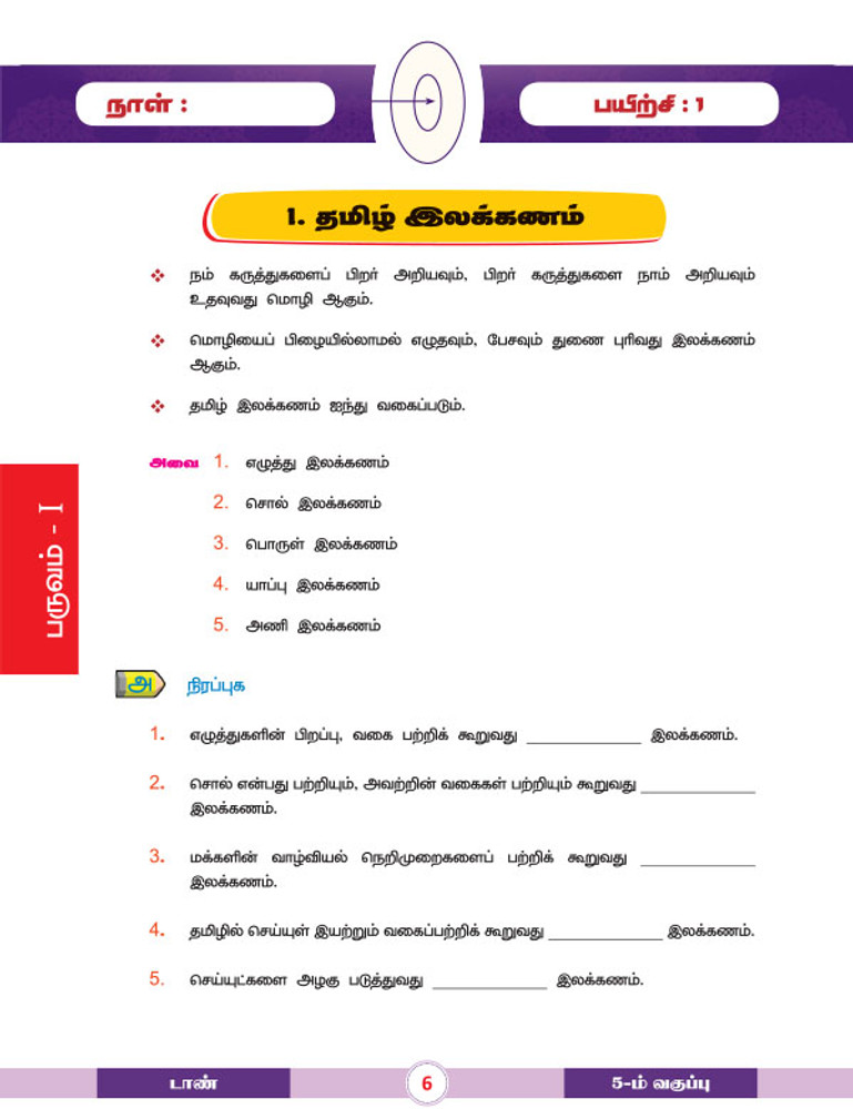 For 5th Std. students, Tamil Grammar part with explanations and exercises.