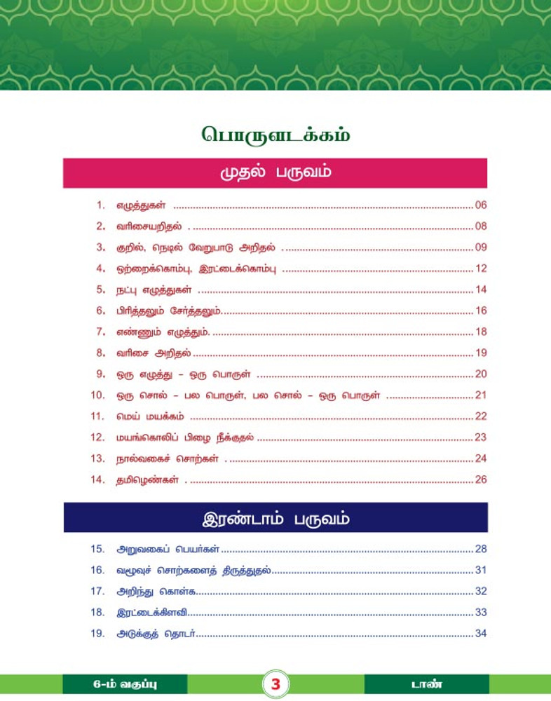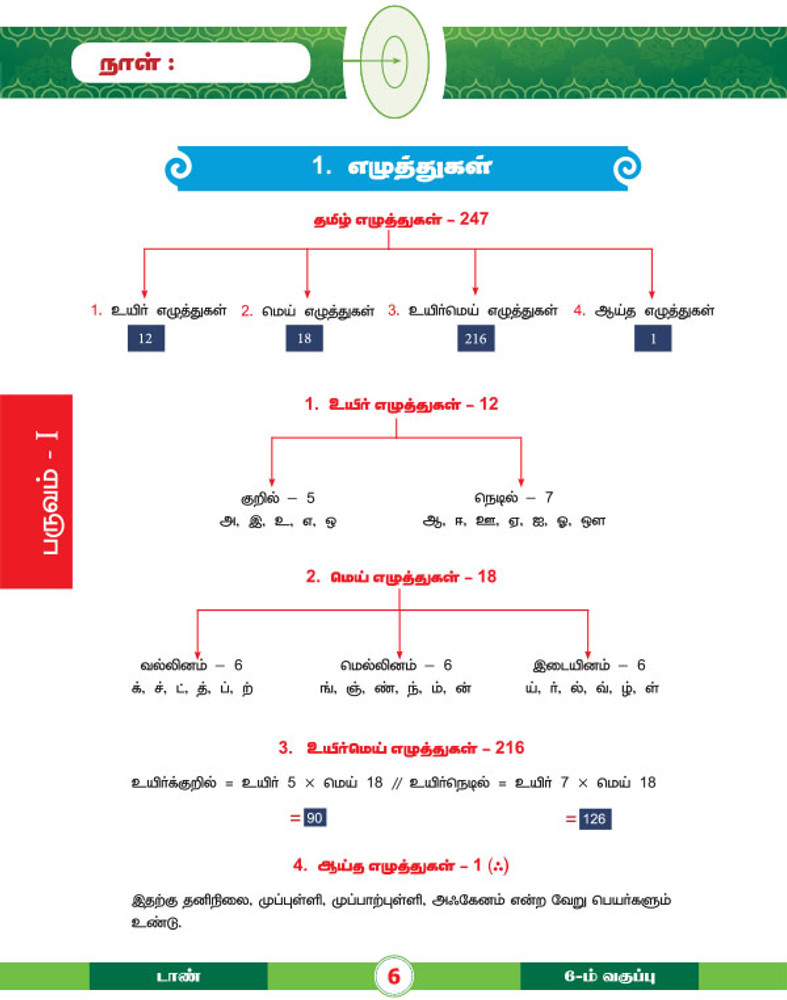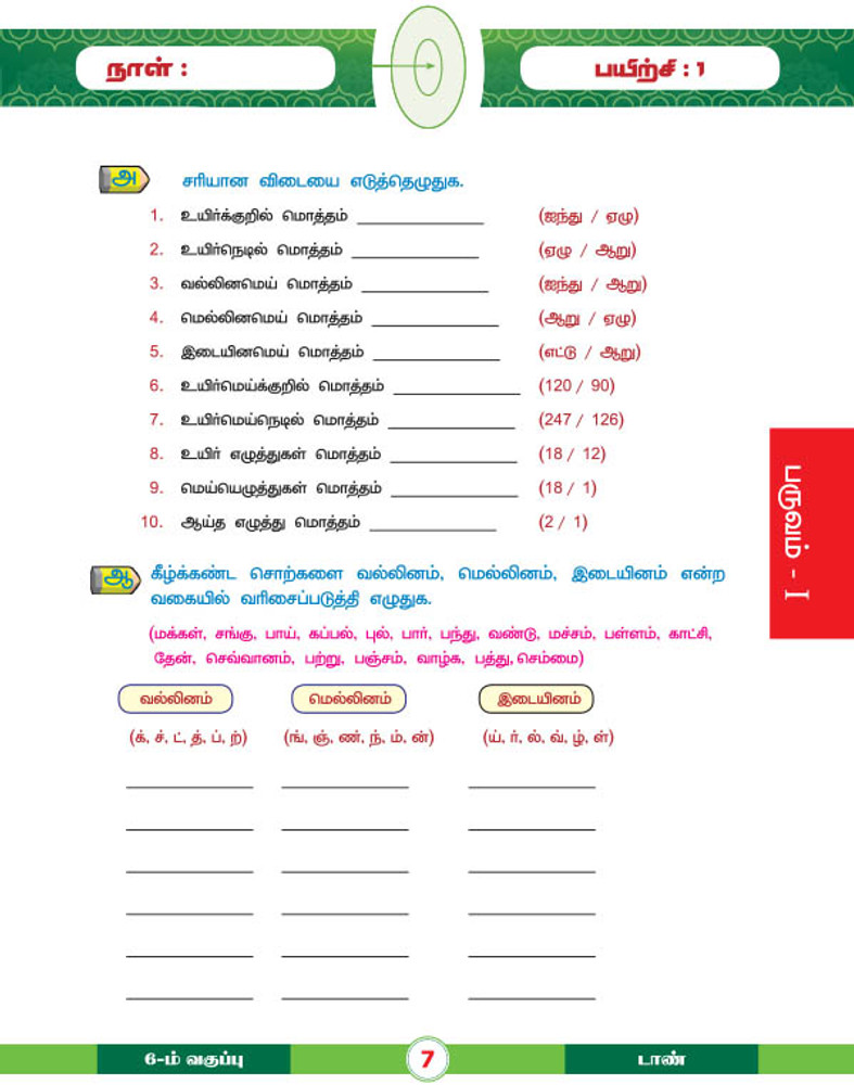 For 6th Std. students, Tamil Grammar part with explanations and exercises.