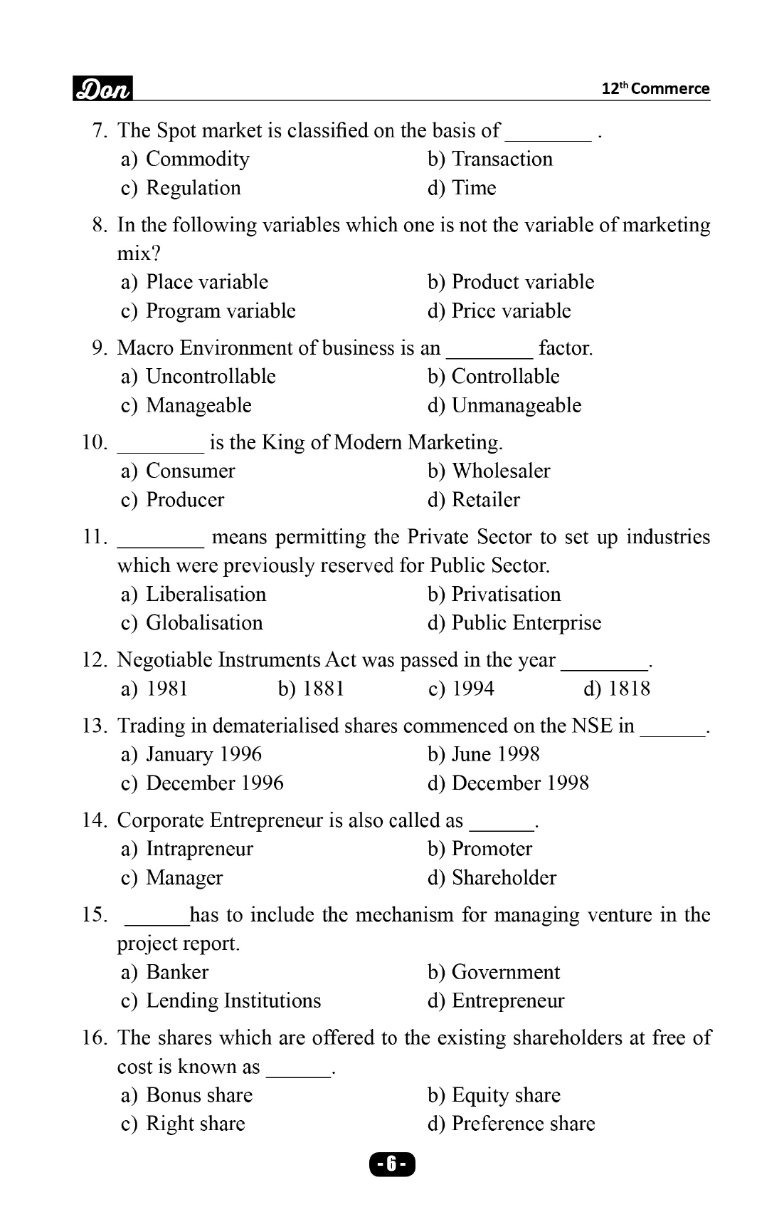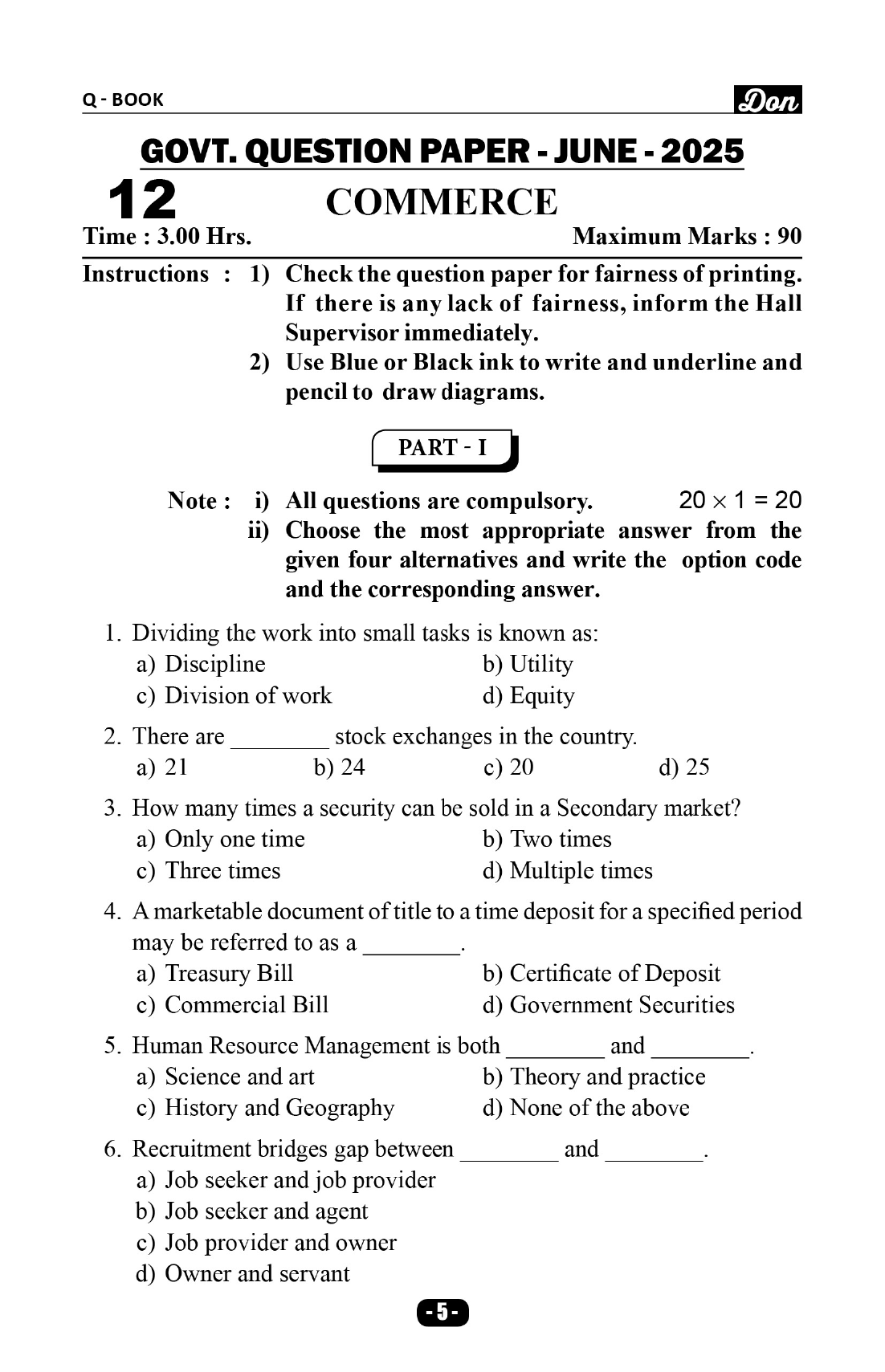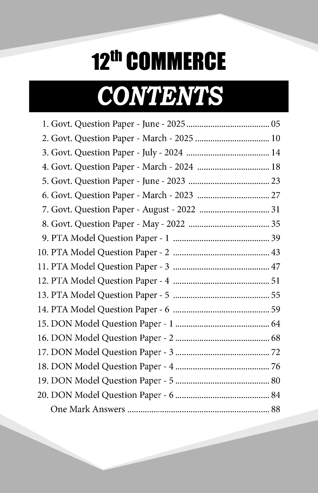 Q Book for 12th Commerce contains almost all the Govt. Qn. papers and PTA Qn. Papers. Besides these, Don Model Question papers are also given in this book. In many Govt. exams, some questions are repeated. And studying these questions thoroughly will help the students score high in board exams and also help them finish the exam in time.