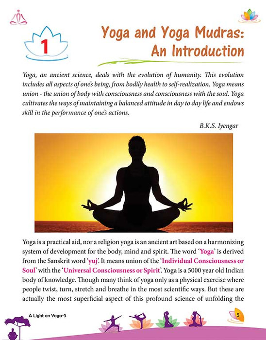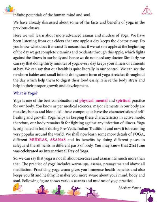 This Yoga book for class III contains many yoga practices explained clearly with pictures. There are exercises at the end of every chapter. So this book can be used in school curriculam.
